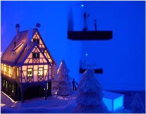 After stepping behind the black curtain of Glenn Walls’ room at TCB, I need to stand still while my eyes adjust to the blue glow inside. It is the same light that illuminates uninvited lint and dandruff in a nightclub. Whew, I’m wearing white but hold on, another eye adjustment is required: this exhibition is one of miniatures. Walls’ collection of mini architectural and naturalistic models protrude from the walls on small black plinths, each printed with acerbic titles like: Mary was obsessed about having sex in the house below. She wanted her wild sexual fantasies to be associated with good taste. The subject, Mary, is meanwhile dancing halfway down a mountain slope that is rising above a modern mini-mansion, in a scene reminiscent of the opening of The Sound of Music. The playfulness of the titles belies the time consuming construction of these tiny slices of life where nature and modernism battle out their aesthetic conflicts. Icebergs, snow-blanketed forests, rolling mountains and shimmering rivers are the homes of nonchalant chimpanzees, people-eating polar bears and insular humans all confronted with modernist architecture. Employing DAS modelling clay, wood, wire and cardboard as the chief materials, Walls has painstakingly created a miniature collection of natural and constructed environments – all rooted in northern hemisphere appearances and each taunting the cultural impacts of modernism. The models measure an average of 30 x 30 x 30cm. Some are longer or taller, but all require a closer examination that puts the viewer in a role of gigantic voyeur, peering into these mini conflicts that, were it not for their titles, would be well placed in a toy museum. Walls’ interest in this series of model works lies in the human presence (or perhaps lack of it) inherent in the International Style architecture of the 20th century Bauhaus School and championed throughout the world by Walter Gropius and Ludwig Mies van der Rohe. Injecting a humorous presence into each micro-set, Walls opens the possibilities behind the façades of traditional and modern constructs that hover over our everyday activities. There is nothing to see here, so fuck off, appears to be the only work absent of modernist trespass, a tiny slice of a natural environment replete with trees, rocks and river, but then one sees the tiny LED bulbs peering over the scene like streetlights. Despite the title’s warning, it is easy to find oneself looking around and under the miniscule trees and rocks wondering whether there is a piece of modernism lurking somewhere in the dark. This kind of intimate engagement, with an equally intimate but saddening creation, is a strong mark of Walls’ work. “I’m a fucking artist. I deserve respect and money,” Billy yelled at his father as he condemned him for making yet another useless minimalist sculpture, conveys the sense of a further and perhaps more personal conflict with the creation and appreciation of art practice that many of us are all too familiar with. By both celebrating and ridiculing modernism, Walls has revealed some of the emotional attachments we hold for buildings and for nature; places imbued with memory but rarely marked by those who have lived in them.