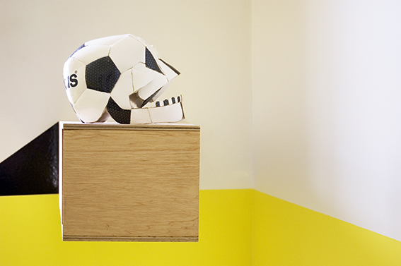 Room 1: Prototype for Sophisticated Living No 3. Adidas soccer ball, wood, fake fur, self-adhesive vinyl.