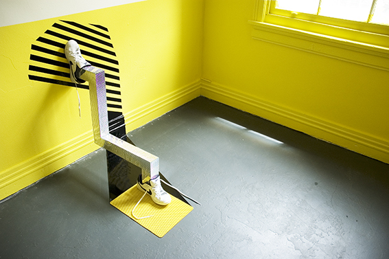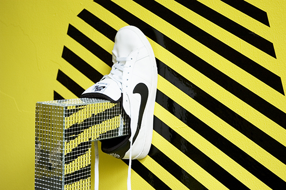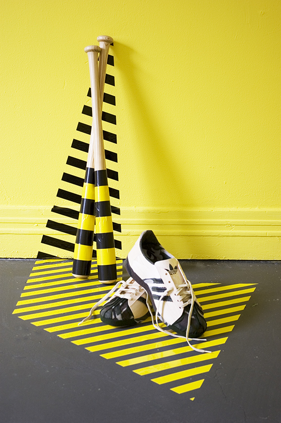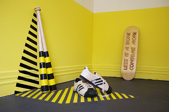 Room 1: Prototype for Sophisticated Living No 4. Adidas Skull Cap sneakers hand made from Balsa wood, felt, Baseball bats, self-adhesive vinyl, skateboard deck.