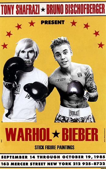 Exposition Andy Warhol et Justin Bieber a New York affiche du 19octobre 2015 gants de boxe pop art graphisme